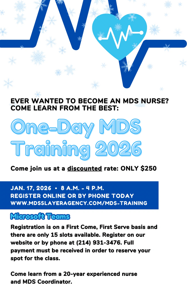 Training sessions will be held based on demand. The next 2025 MDS Classes will be January 17, 2026. Please click the link below to register.